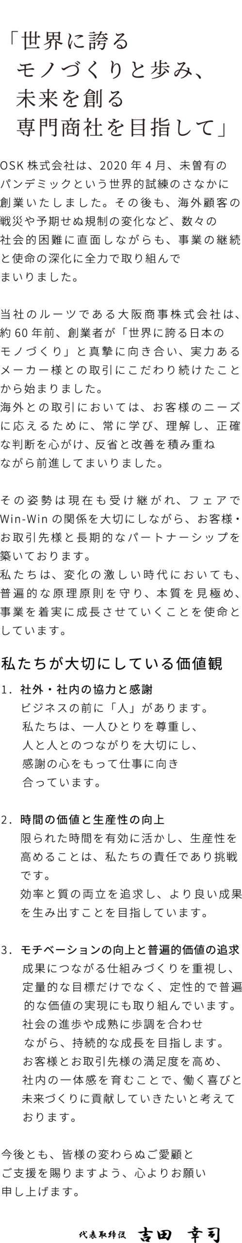 当社のルーツである大阪商事株式会社は、約60年前、創業者が「世界に誇る日本のモノづくり」と